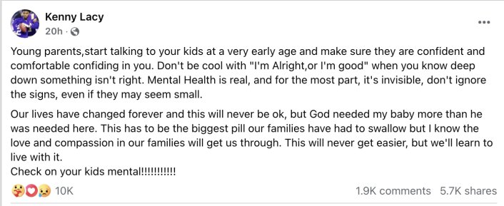 Lacy’s father, Kenny, shared a deeply emotional message on Facebook, urging parents to stay closely connected to their children’s mental and emotional health: