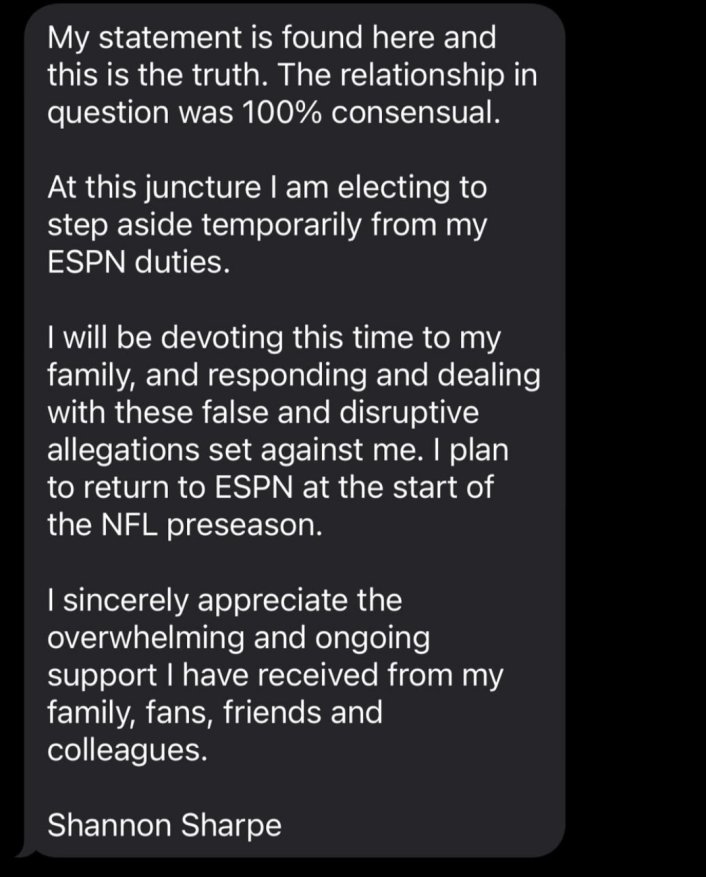 In a statement posted on Thursday (April 23), Shannon wrote, "'My statement is found here and this is the truth. The relationship in question was 100% consensual. At this juncture I am electing to step aside temporarily from my ESPN duties. I will be devoting this time to my family, and responding and dealing with these false and disruptive allegations set against me. I plan to retire to ESPN at the start of the NFL preseason."