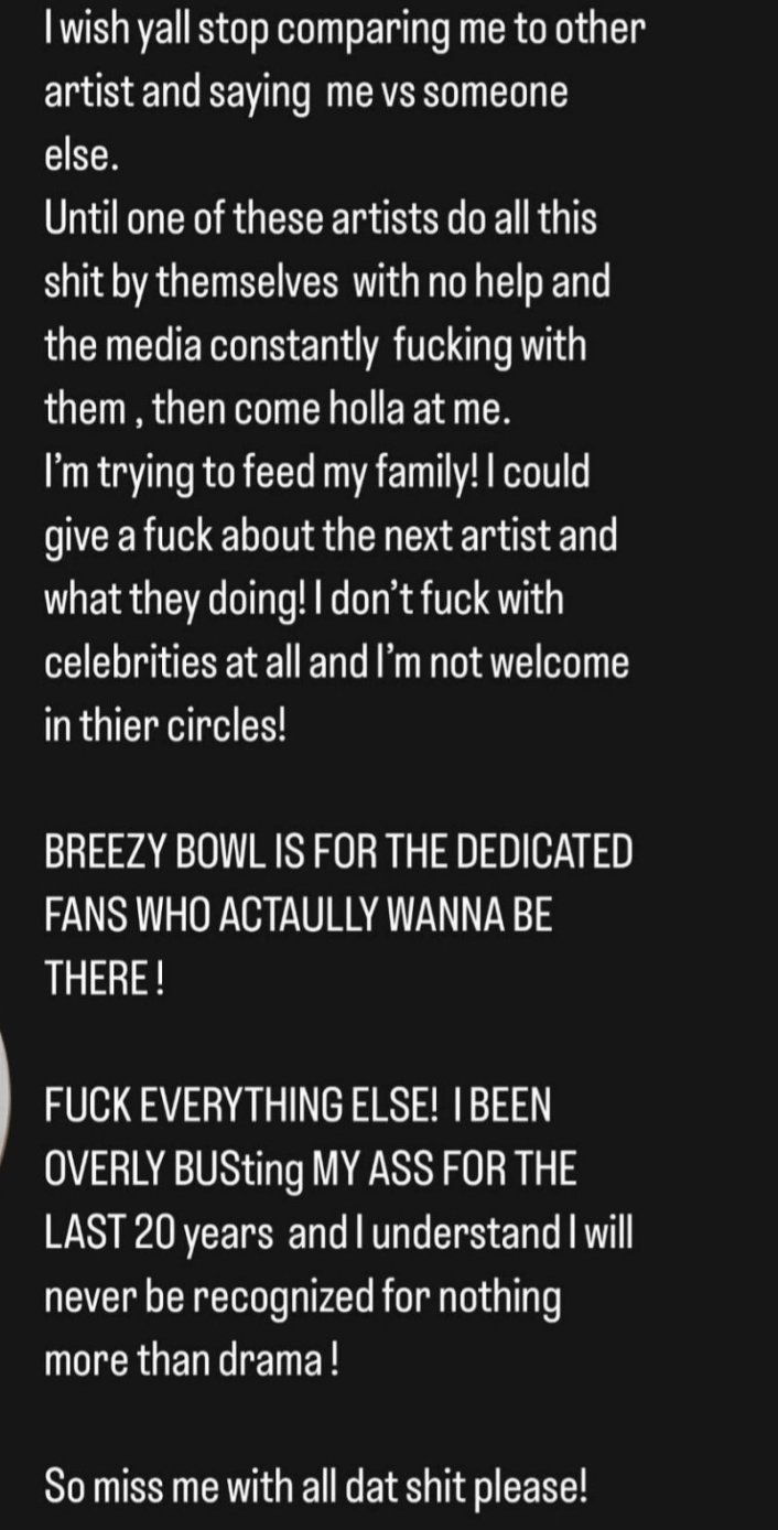 “I wish y’all stop comparing me to other artists and saying me versus someone else,” Brown wrote. “Until one of these artists does all this by themselves with no help—and the media constantly messing with them—then come talk to me. I’m trying to feed my family. I could care less about the next artist and what they’re doing.”